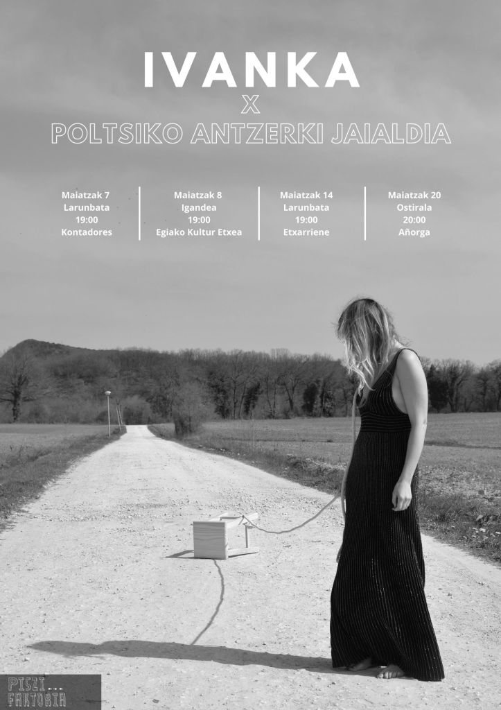 Donostiako Poltsiko Antzerki Jaialdiak antolatzen duen lehiaketa irabazi ondoren, maiatzaren 7an, larunbatean, estreinatuko dugu IVANKA, gure azken lana, Donostiako jaialdiaren programazioaren barruan. Herrera auzoko Kontadores Zentroan izango da, 19:00etan, doako sarrerarekin.